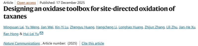 生物催化与合成生物团队郁惠蕾课题组在Nature Communications上发表题为“Designing an oxidase toolbox for site-directed oxidation of taxanes”的研究论文(doi.org/10.1038/s41467-025-67544-4)。该研究成功开发出一种紫杉烷非天然氧化酶工具箱,能够实现紫杉烷骨架 C-4、C-6、C-10、C-11、C-12 和 C-13 位点的区域和立体选择性氧化。该工具箱不仅实现了11个紫杉烷新结构的高效合成,更为人工重构紫杉醇及其类似物的高效合成路线奠定了坚实基础。