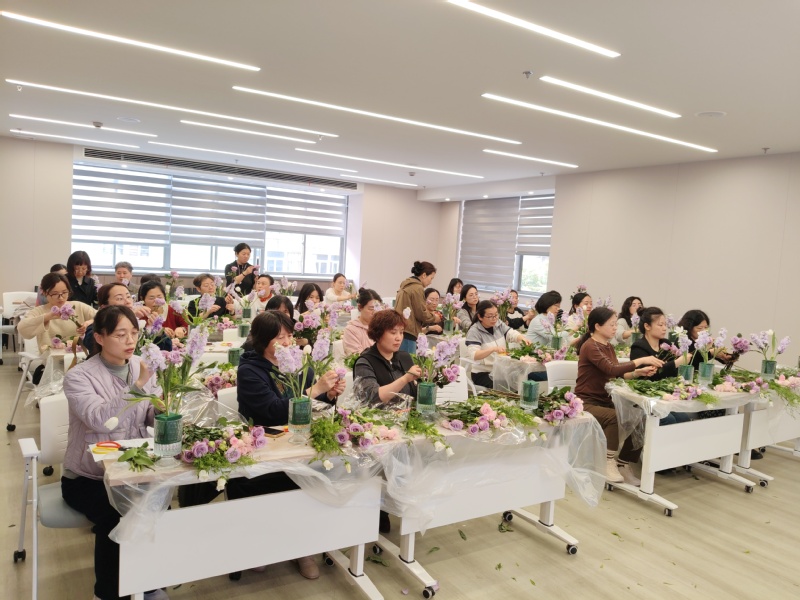 活动特邀专业花艺教师现场授课花艺教师从花材识别、色彩搭配到造型设计,深入浅出地讲解了插花的基础知识与实用技巧。在随后的插花创作环节,老师们兴致盎然,精心挑选花材,修剪枝叶、构思层次、搭配色彩,将一朵朵鲜花错落有致地插入花瓶中。现场花香四溢,气氛温馨愉悦,大家在动手创作中放松身心,于花木间感受自然之美,在巧思中体验艺术之趣。