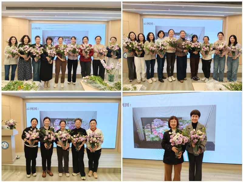 经过一个小时的精心制作,一瓶瓶独具匠心、赏心悦目的插花作品陆续呈现。大家手捧亲自创作的花艺作品,在镜头前合影留念,定格下这充满成就感的温馨瞬间。活动结束后,老师们将亲手制作的花艺作品带回办公室将春意与美好长久留存